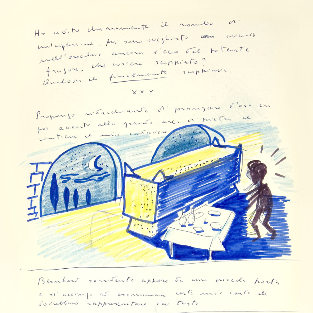 Spento il set del giorno, resta il laboratorio notturno. Nel Libro dei sogni Fellini si vede rimbalzare su prime pagine che annunciano la sua scomparsa, titoli enormi come cartelli di un film muto. Poi l’inquadratura si sposta: Fellini di profilo, sotto un cappio già tirato; un’altra notte è pietra — una bara che lo accoglie e, accanto, lui che pranza con calma, come se tra una forchettata e l’eternità ci fosse solo un respiro. Altrove è di spalle, due guardie ai lati, mentre un plotone prova la mira; e quando i sogni si diradano, compare l’immagine che resta: davanti alla porta del suo studio, al posto della buca delle lettere, una lapide incisa “disperso dei dispersi”; in mano un foglio bianco da imbucare. Messaggio senza destinatario, congedo senza parole. Accanto a lui passano anche gli altri: Giulietta Masina, Ernest Bernhard, Pablo Picasso, Aldo Palazzeschi, Sophia Loren, Eduardo De Filippo. Il sogno li mette in figura con un bordo ironico, una didascalia non sempre disegnata, e li spoglia dell’angoscia.